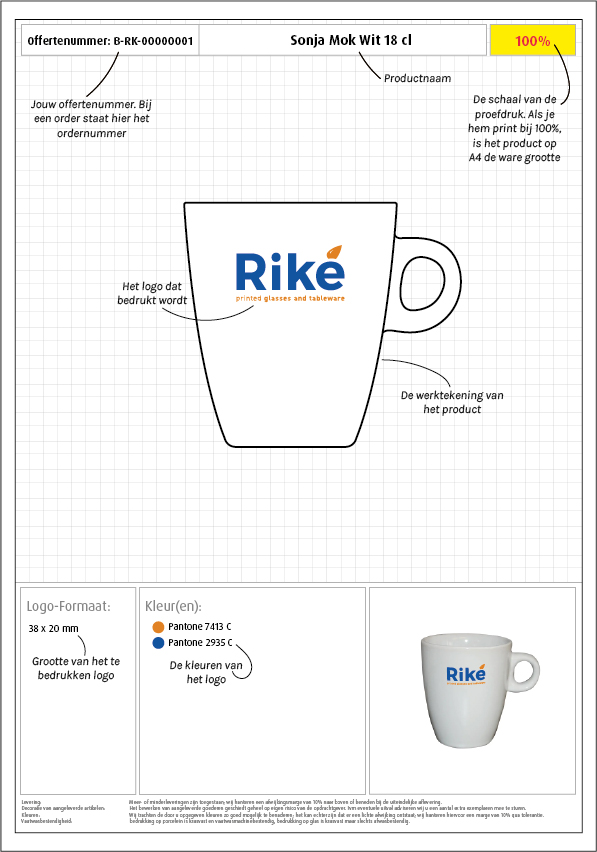 Een drukproef is het eerste opzetje van het uiteindelijke eindresultaat. Dit kan een fysieke of een digitale drukproef zijn. Meestal versturen we een digitale drukproef. Dit is vaak voldoende. Maar het is zeker mogelijk om ook een fysieke drukproef aan te vragen. Je ontvangt dan een sample (met of zonder logo, net wat jij wilt) van het product dat je voor ogen hebt. Dit kan in overleg met ons.